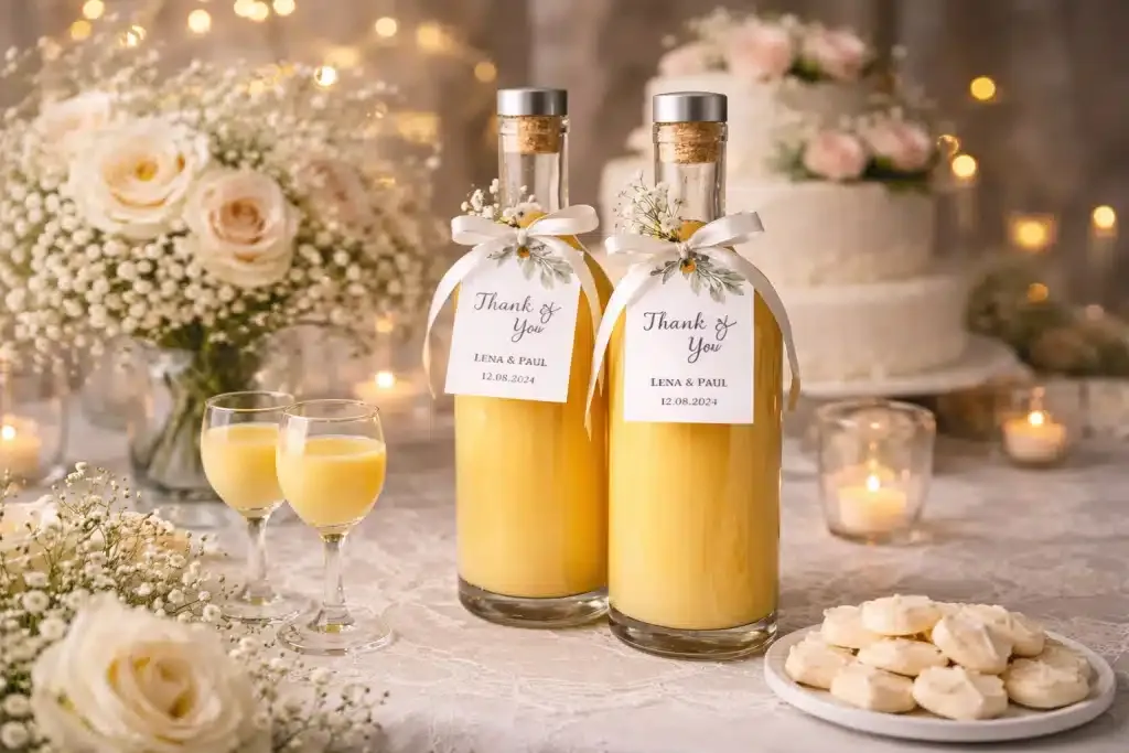Kleine Fläschchen mit Eierlikör sind als Gastgeschenk beliebt, weil sie dekorativ und gleichzeitig praktisch sind. Die handliche Größe eignet sich gut, um sie an den Platzkarten zu befestigen oder in Willkommensboxen zu integrieren.