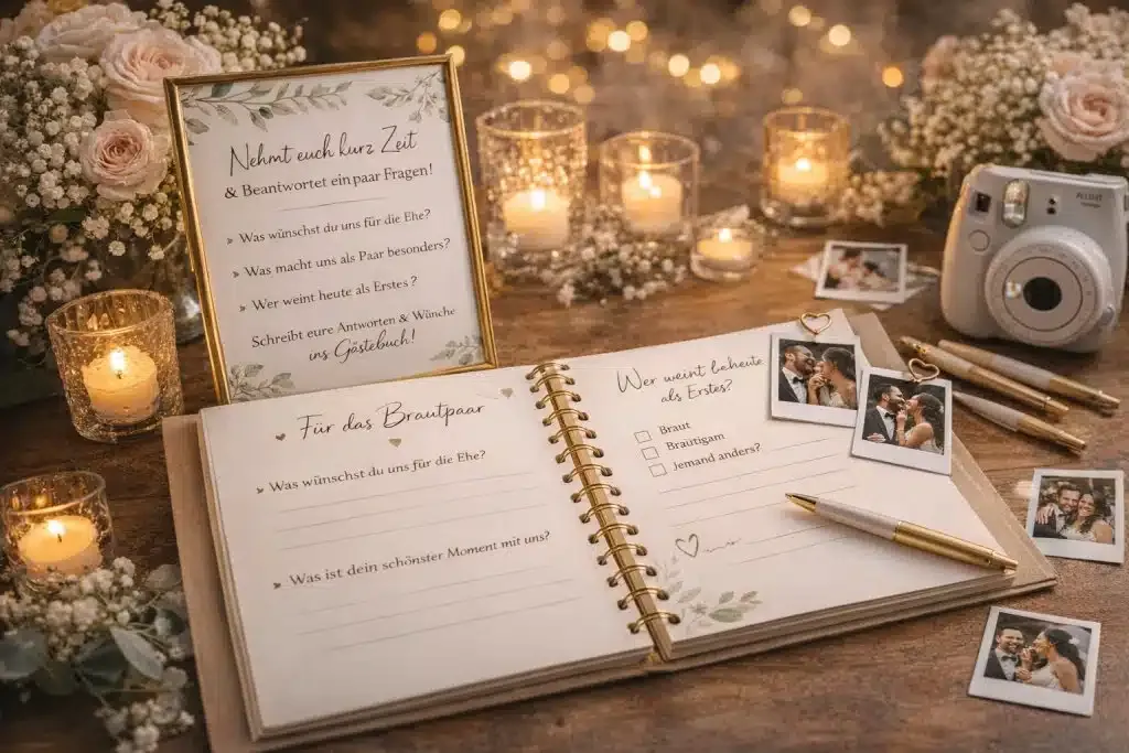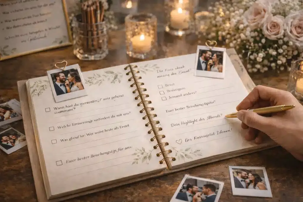 Die schönste Lösung ist deshalb ein Gästebuch Hochzeit mit Fragen. Denn Fragen holen mehr heraus als Standard-Sprüche – sie bringen Gäste zum Erzählen, zum Lächeln, zum Zurückdenken. Und am Ende entsteht nicht nur ein Buch voller Unterschriften, sondern ein Schatz voller echter Geschichten.