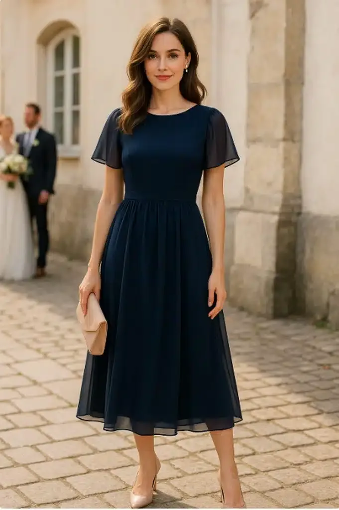 Look 1: Der klassische Midi-Look Ein Hochzeitsgast Kleid in Navy oder Dunkelgrün mit Midi-Länge verkörpert zeitlose Eleganz. Kombiniert mit mittelhohen Pumps und einer strukturierten Handtasche entsteht ein Look, der Respekt vor dem Anlass zeigt, ohne übertrieben förmlich zu wirken.
